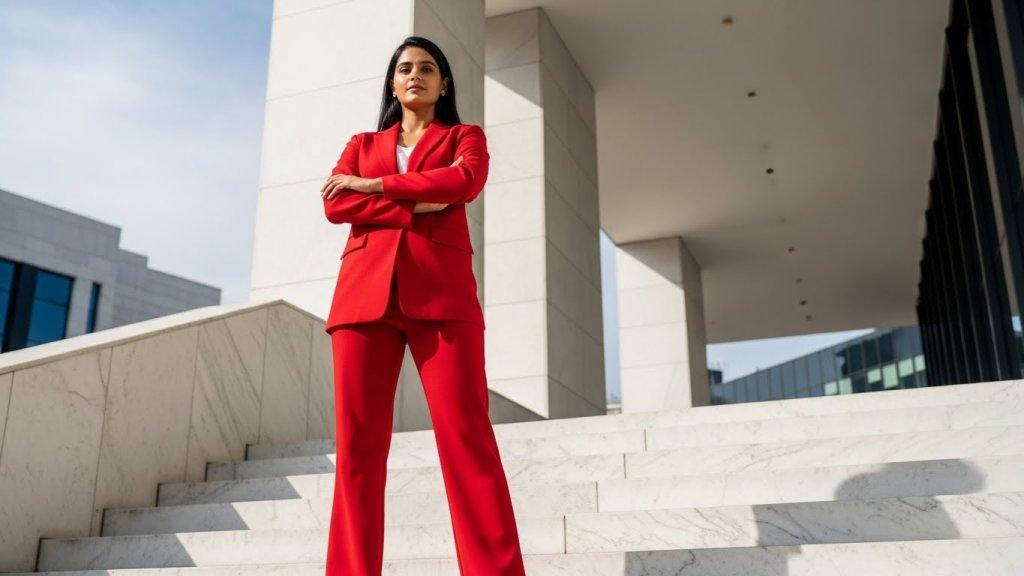 Scroll to read allHyper-realistic full-body low-angle shot of an Indian woman aged 26-32 wearing a bold monochrome red power suit. Natural skin tone, confident posture, arms crossed. Standing on marble steps of a modern building. Strong architectural lines, leadership energy.