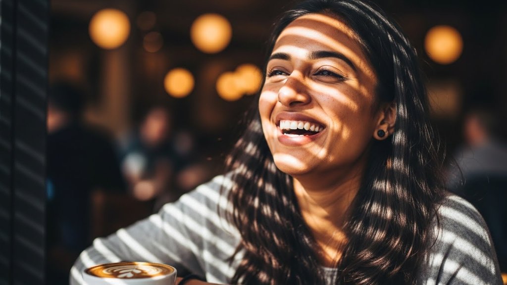 Scroll to read allHyper-realistic candid cafe portrait of an Indian woman aged 24-28 laughing naturally at a table. Casual chic outfit, latte art coffee in foreground. Natural skin tone with fine pores, sunlight through cafe blinds creating soft shadow patterns on her face. Shot with an 85mm portrait lens.