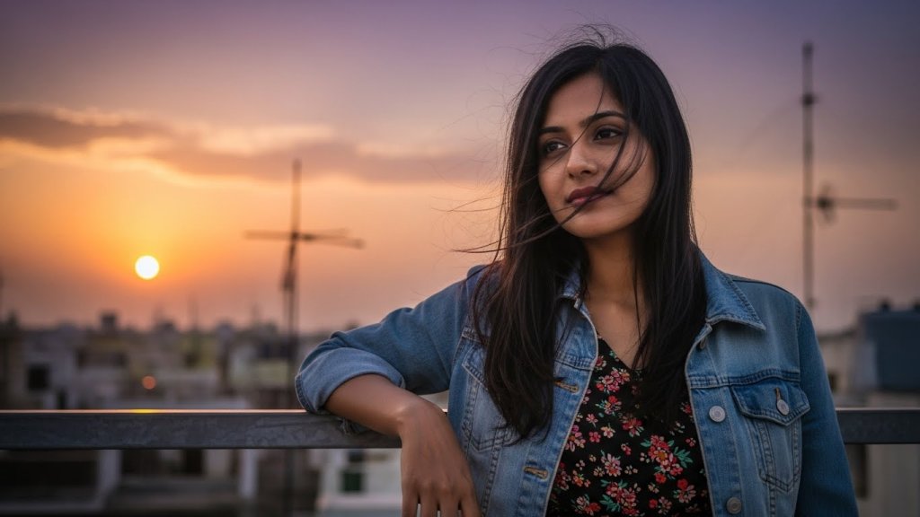 Scroll to read allHyper-realistic rooftop portrait of an Indian woman aged 24-28 leaning on a railing during sunset. Natural skin tone softly lit, wind moving her long straight black hair. Wearing a denim jacket over a floral dress. Purple-orange sky, nostalgic mood, cinematic evening light.