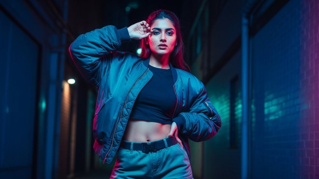 Scroll to read allHyper-realistic image of an Indian woman aged 22-26 posing confidently in a neon-lit urban alley at night. Natural skin tone with visible pores, sharp jawline, intense eye contact. Wearing high-end streetwear: oversized bomber jacket, crop top, cargo pants. Blue and pink neon reflections on skin. Cyberpunk urban mood, high contrast, cinematic framing.
