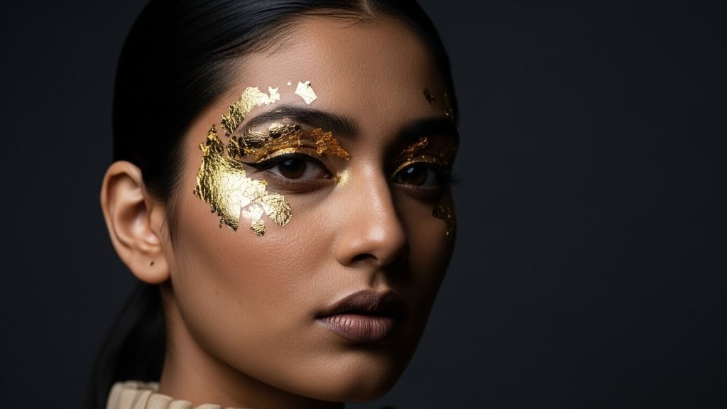 Scroll to read allHyper-realistic close-up editorial portrait of an Indian woman aged 24-29. Natural skin texture preserved under dramatic lighting, subtle pores visible. Avant-garde makeup with gold leaf accents, slicked-back hair. Haute couture styling. Chiaroscuro studio lighting, magazine-cover realism.