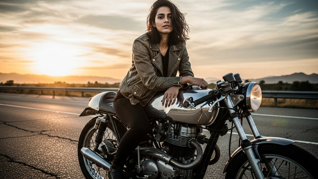 Scroll to read allHyper-realistic cinematic shot of an Indian woman aged 25-30 sitting on a vintage cafe racer motorcycle. Wearing a leather biker jacket and black jeans. Natural skin texture, wind-blown hair. Sunset highway background, gritty textures.