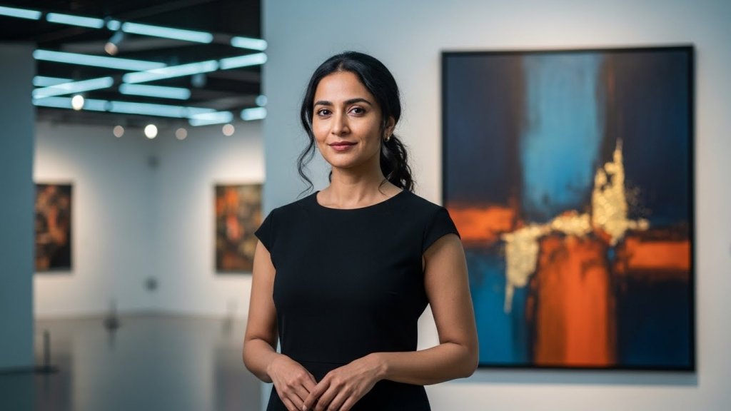 Scroll to read allHyper-realistic portrait of an Indian woman aged 26-31 standing in a modern art gallery. Wearing a minimalist black dress. Natural skin texture, composed confident expression. Cool gallery lighting, abstract art backdrop.