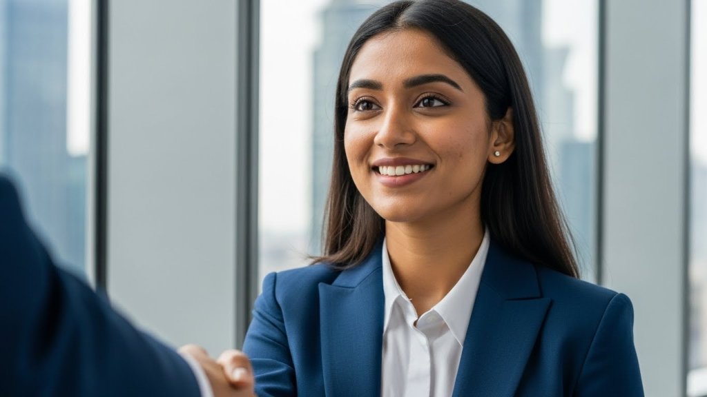 Scroll to read allHyper-realistic close-up of an Indian woman aged 27-33 shaking hands with a business partner. Natural skin tone with fine pores, professional smile. Wearing a navy blue suit. Background shows a blurred city skyline through glass windows. Clean corporate aesthetic, trust and success conveyed.