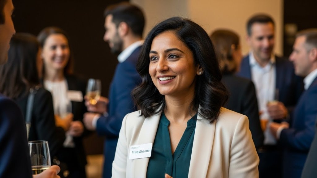 Scroll to read allHyper-realistic image of an Indian woman aged 25-32 networking at a business event. Smart casual outfit, name badge visible. Natural skin texture, confident friendly smile. Background softly blurred with professionals in conversation. Warm indoor lighting.
