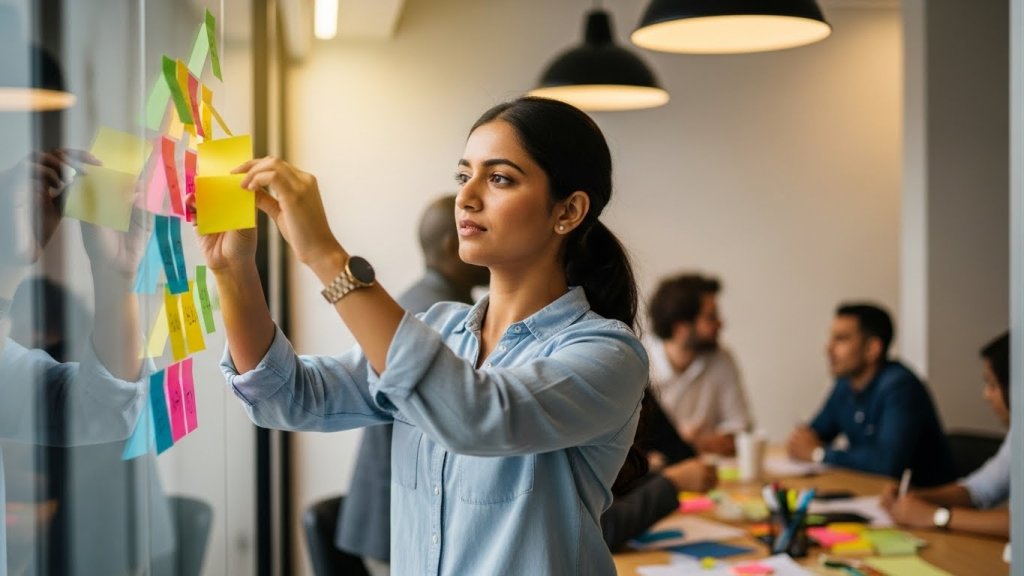 Hyper-realistic portrait of an Indian woman brainstorming with sticky notes, highlighting natural skin texture, engaged expression, collaborative startup environment, soft office lighting, and authentic creative teamwork realism.