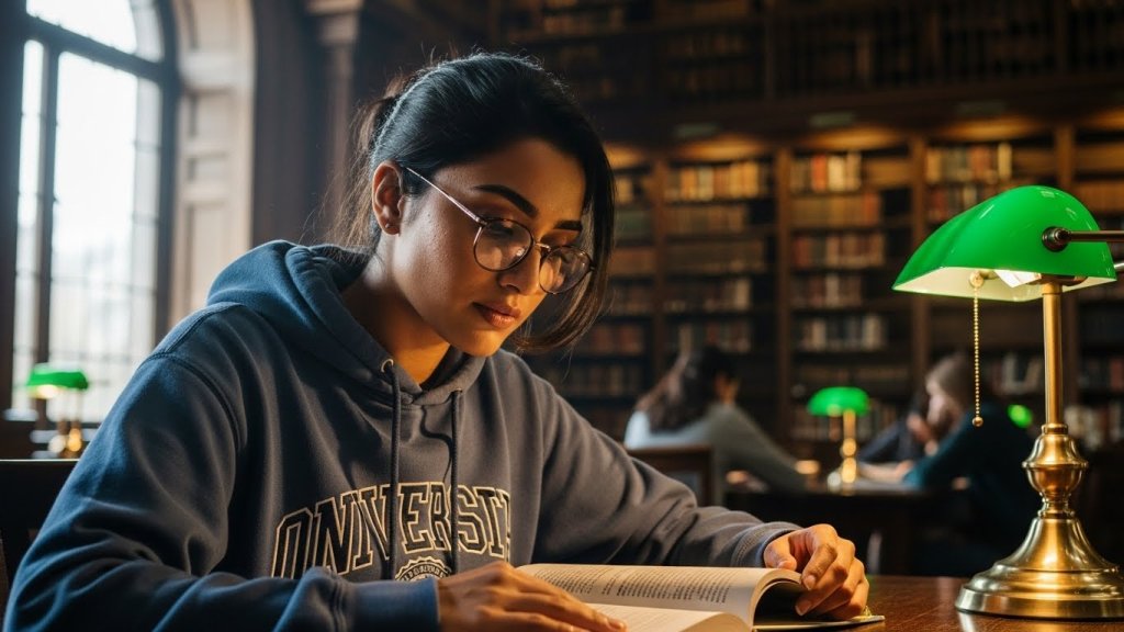 Hyper-realistic portrait of an Indian woman studying in a university library, featuring natural skin texture, minimal makeup, college attire, warm wooden interiors, soft window light, and refined dark-academia realism.