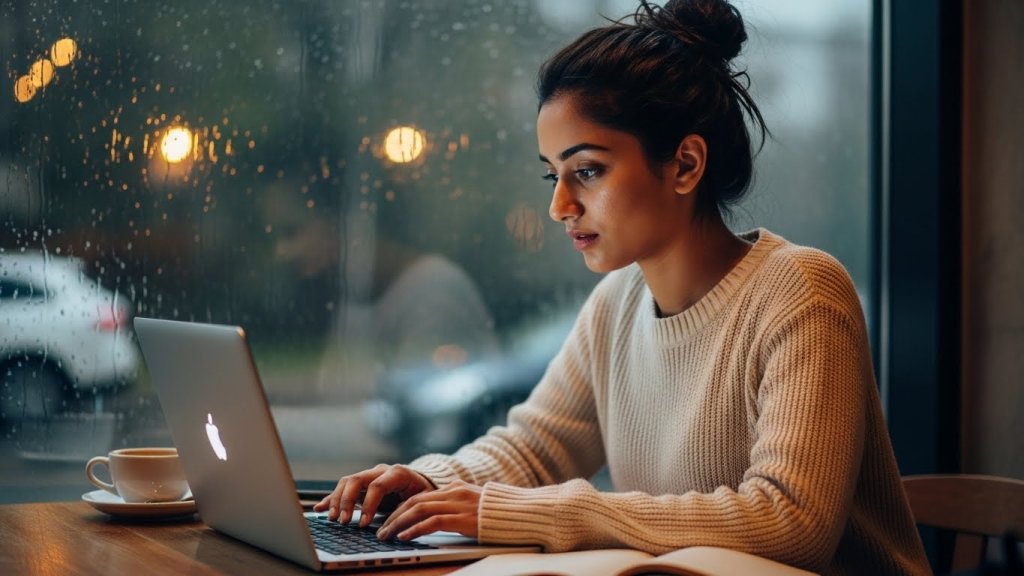 Hyper-realistic cafe portrait of an Indian woman studying on a laptop, featuring natural skin texture, cozy oversized sweater, rainy window backdrop, subtle under-eye detail, and calm lo-fi study realism.