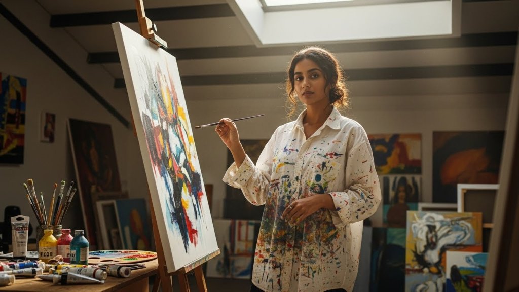 Hyper-realistic portrait of an Indian woman in an art studio, showcasing natural skin texture, paint-splattered creative attire, skylight illumination, artistic expression, and authentic contemporary creative-workspace realism.