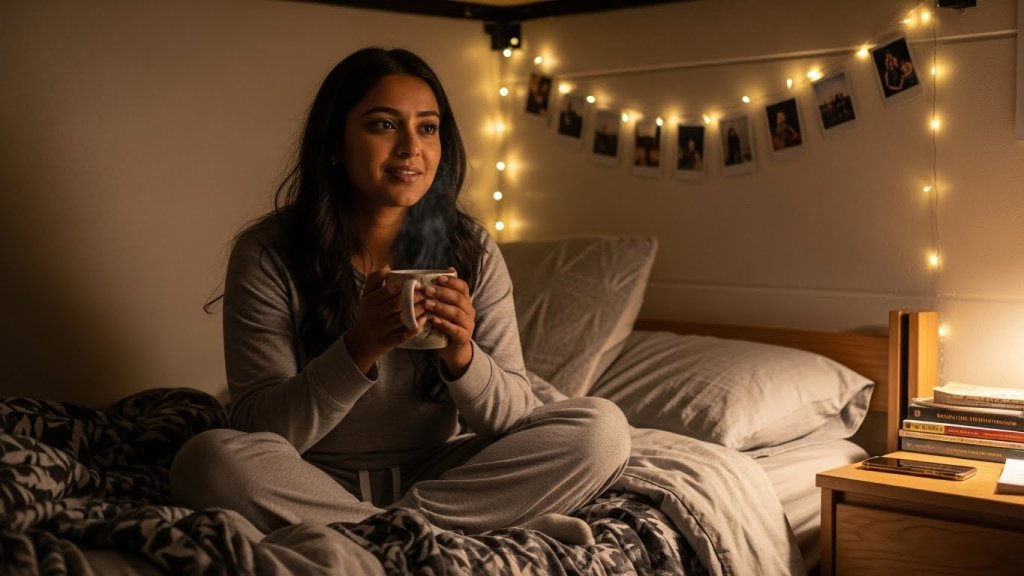 Generate a hyper-realistic dorm room lifestyle portrait prompt featuring an Indian woman, natural skin texture, cozy lighting, fairy lights decor, casual pajamas, intimate student atmosphere, and authentic cinematic realism.