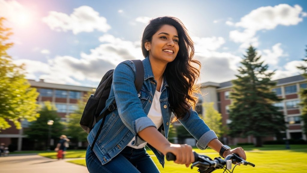 Generate a hyper-realistic campus action portrait prompt featuring an Indian woman skating or cycling, natural skin texture, dynamic motion blur, sunny daylight, realistic surroundings, and energetic cinematic realism.