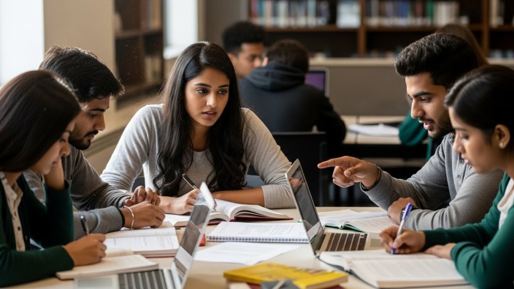 Generate a hyper-realistic student group project portrait prompt featuring Indian classmates, natural skin texture, casual campus attire, collaborative learning environment, realistic lighting, and authentic academic realism.
