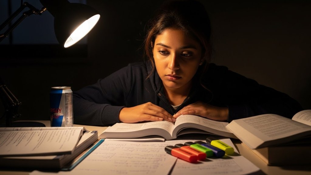 Generate a hyper-realistic late-night study portrait prompt featuring an Indian woman with natural skin texture, focused tired expression, desk lamp lighting, academic details, and authentic cinematic low-light realism.