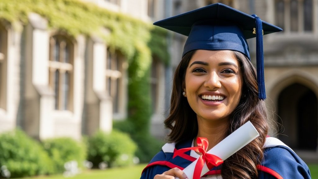 Generate a hyper-realistic graduation portrait prompt featuring an Indian woman in cap and gown, natural skin texture, joyful expression, university backdrop, celebratory daylight, and polished cinematic realism.