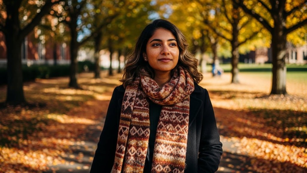 Generate a hyper-realistic campus lifestyle portrait prompt featuring an Indian woman in autumn scenery, natural skin texture, seasonal fashion, cinematic lighting, calm mood, and ultra-detailed 8K realism.
