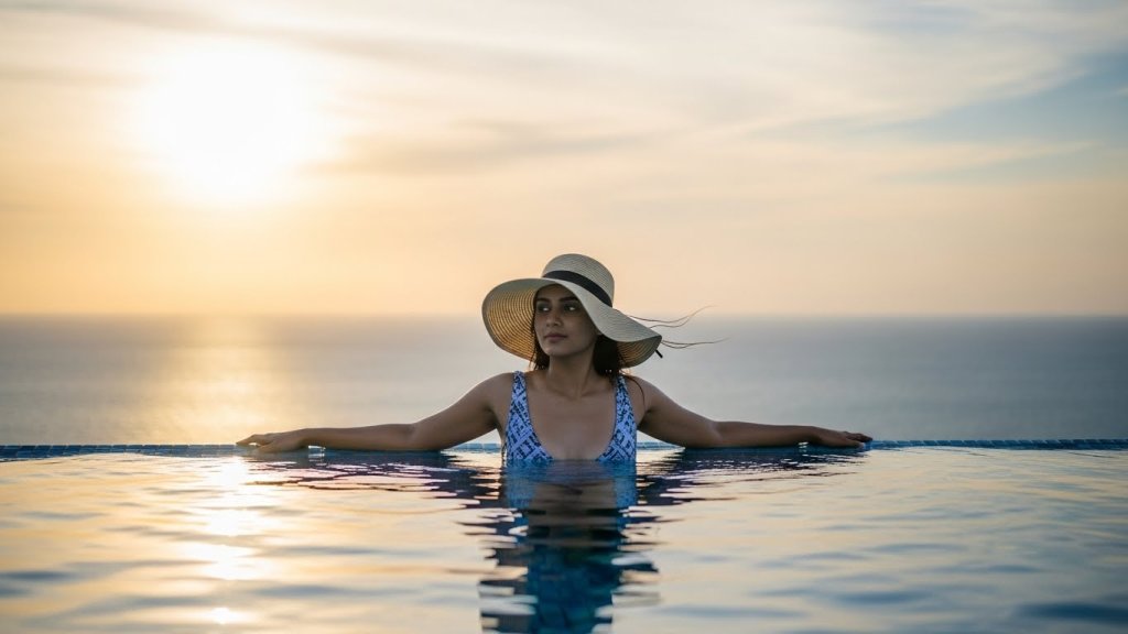 Scroll to read allHyper-realistic portrait of an Indian woman aged 23-29 leaning on an infinity pool edge overlooking the ocean. Designer swimwear, sun hat. Natural skin tone glowing in sunset light. Serene, aspirational travel mood.