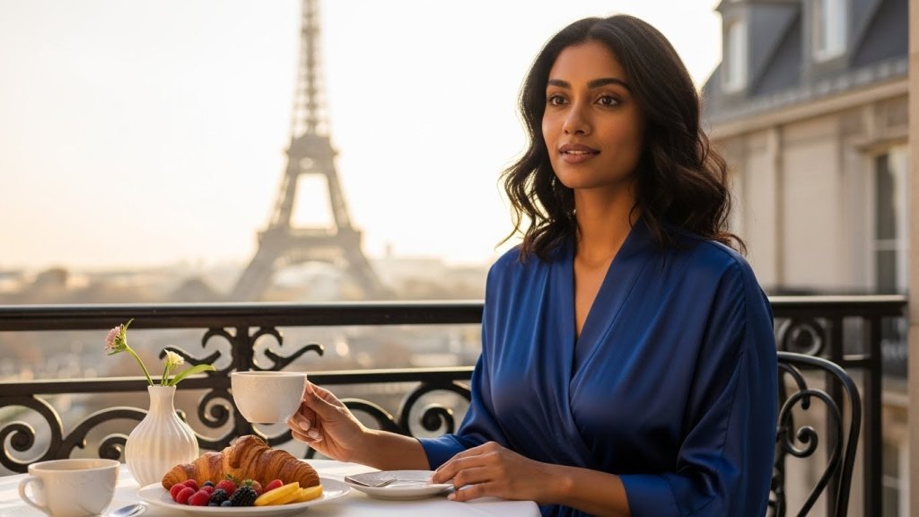 Generate a hyper-realistic luxury lifestyle portrait prompt featuring an Indian woman enjoying breakfast on a Parisian balcony, natural skin texture, elegant styling, morning light, iconic city backdrop, and cinematic realism.