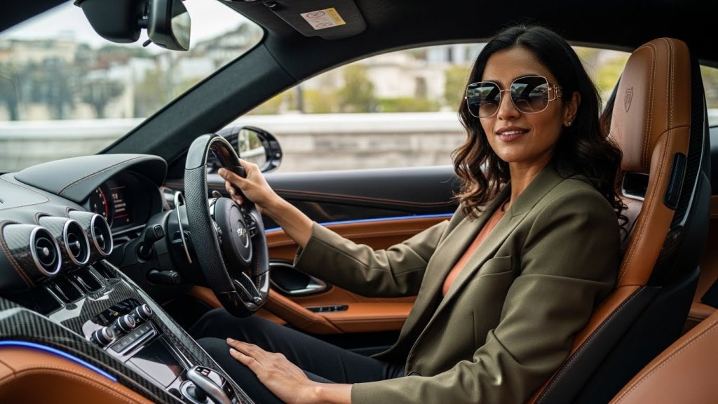 Generate a hyper-realistic luxury automotive portrait prompt featuring an Indian woman inside a premium sports car, natural skin texture, confident expression, designer styling, detailed interiors, and cinematic high-end realism.