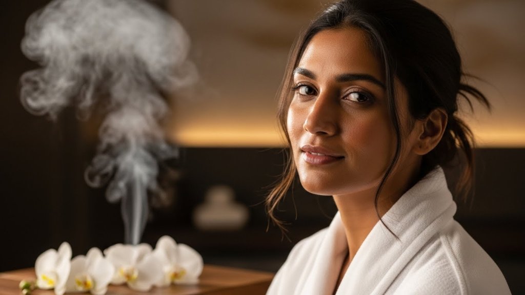 Generate a hyper-realistic luxury spa portrait prompt featuring an Indian woman with natural skin texture, relaxed posture, white robe styling, serene wellness environment, soft steam details, and premium cinematic realism.