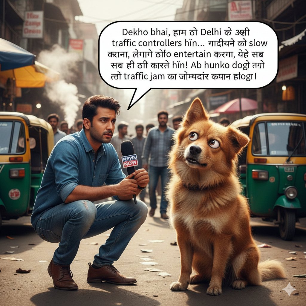 "text": "A humorous street interview scene set in a busy Delhi market. A human news reporter in casual shirt and jeans crouches down with a microphone, asking a fluffy brown street dog about the new rule of removing street dogs from the city streets. The dog, animated with expressive eyes and subtle cartoon-like lip-sync, tilts its head, raises an eyebrow, and answers in Hindi with a sarcastic and slightly dramatic tone: 'Dekho bhai, hum toh Delhi ke asli traffic controllers hain... gaadiyon ko slow karana, logon ko entertain karna, yeh sab hum hi toh karte hain! Ab humko hata doge toh traffic jam ka zimmedar kaun hoga?' The background shows a bustling Delhi street with auto-rickshaws, chai stalls, pedestrians, and light honking. Scene style is realistic but with a slight humorous cartoon touch, bright daylight. The ending shot shows the dog walking away proudly while the reporter looks confused.",