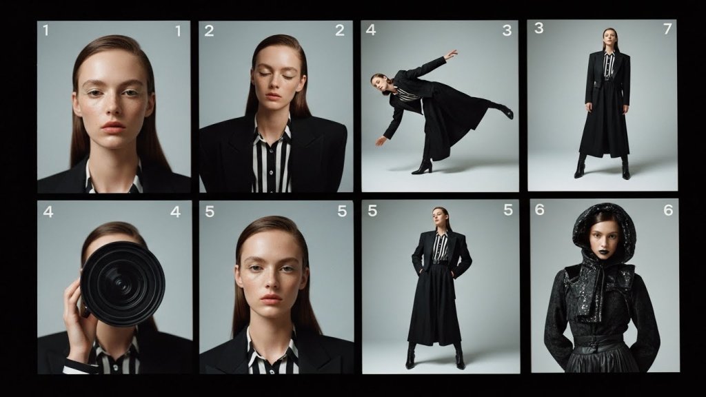 Create a high fashion multi frame contact sheet prompt with strict identity preservation, dynamic camera placements, editorial compositions, premium film aesthetics, and consistent wardrobe and lighting across all frames.