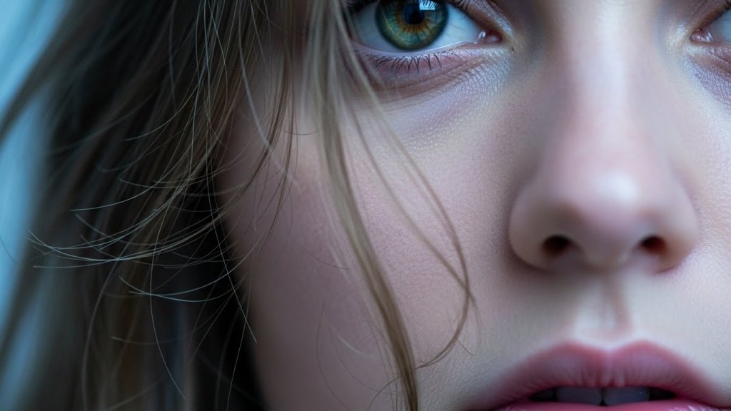 Scroll to read allCreate an extreme close up macro portrait using the reference image as a strict identity source with zero deviation. The composition is left eye dominant, cropped extremely close while keeping the left eye, bridge of the nose, and softly parted lips visible.