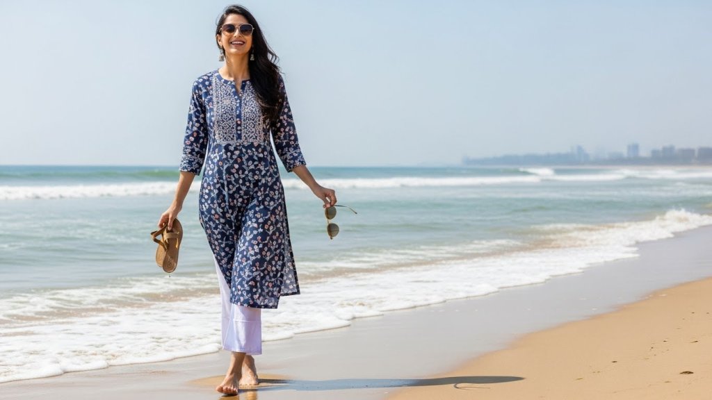 Scroll to read allA cheerful woman walking barefoot along the beach, waves gently touching her feet. She’s wearing the kurti shown in image and white flared pants rolled slightly above the ankles. She’s holding her sandals in one hand and sunglasses in the other, with a joyful smile. The background shows the ocean, blue sky, and soft sand â€" a breezy, carefree atmosphere.