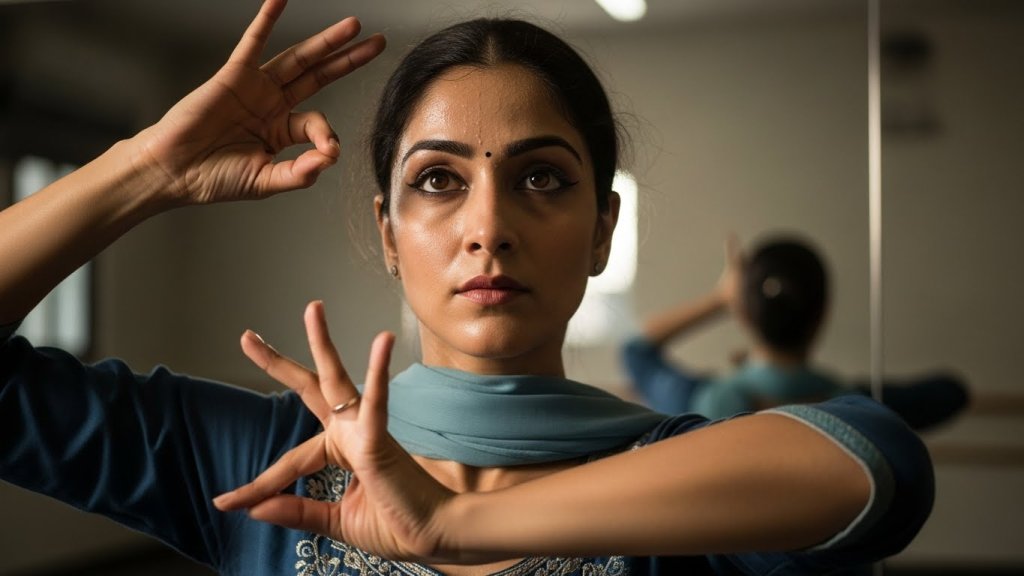A hyper-realistic portrait of a girl practicing Kathak mudras in a studio. Featuring expressive eyes, natural skin textures, and a realistic sweat sheen under soft lighting for an authentic dance aesthetic.