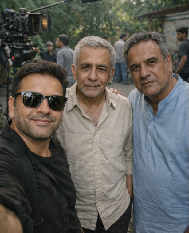 Style: photorealistic, candid BTS moment, looks like a real behind-the-scenes selfie taken during a Bollywood movie shoot.