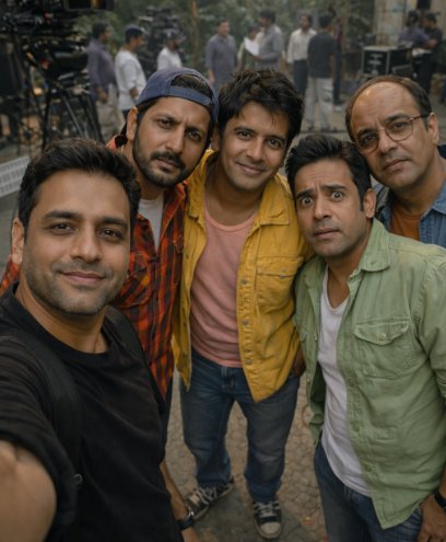 Style: highly photorealistic, candid behind-the-scenes moment, looks like a real BTS selfie clicked casually during the Dhamaal shoot.
